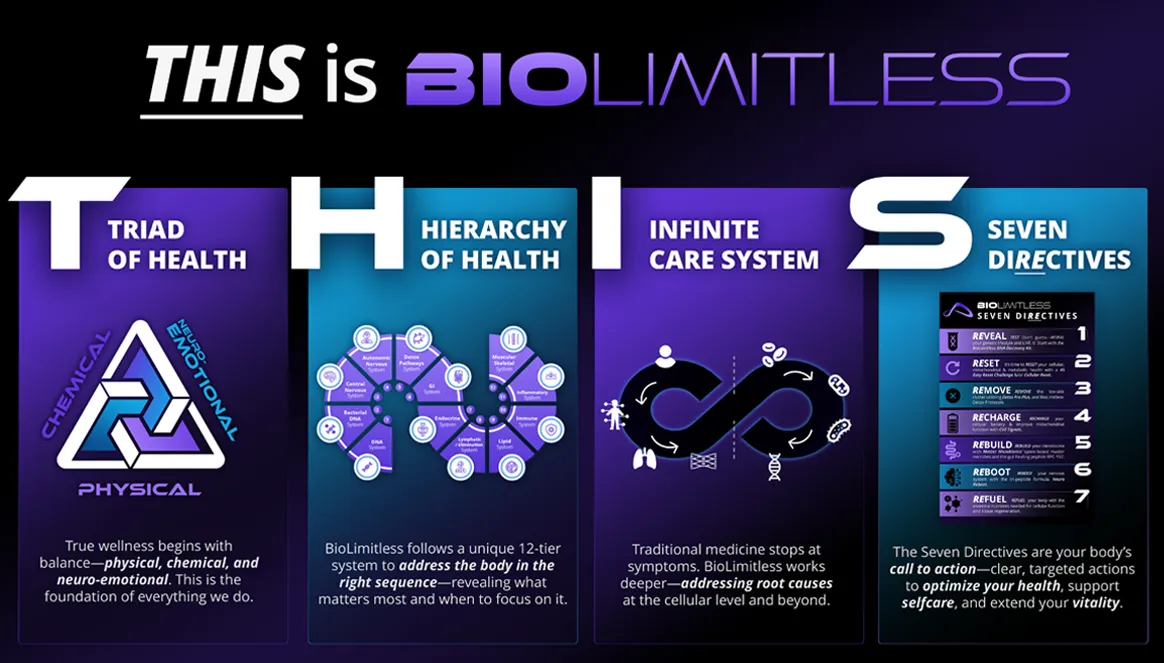The T.H.I.S. Framework is the foundational philosophy behind the BioLimitless approach to health and wellness. It stands for Triad of Health, Hierarchy of Health, Infinite Care System, and Seven Directives.